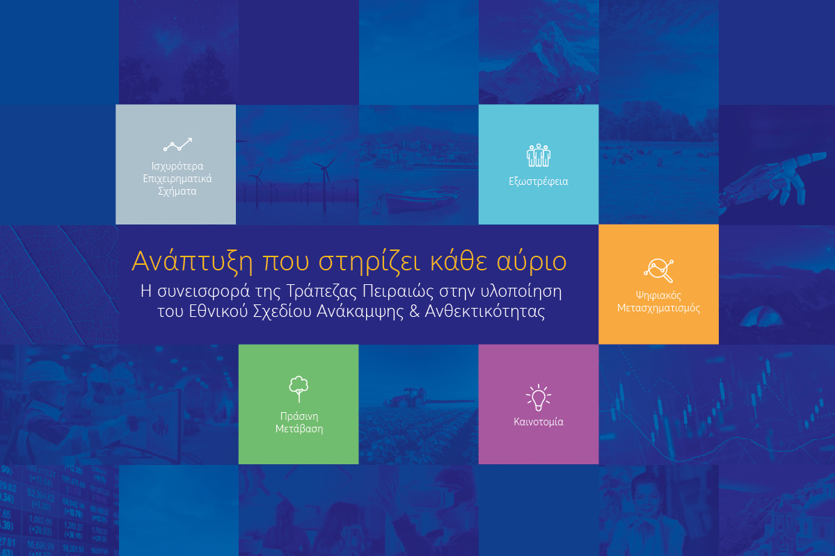 Προσανατολισμένη σταθερά στην πράσινη ανάπτυξη και ψηφιοποίηση, με έμφαση στην εξωστρέφεια, την καινοτομία και τη δημιουργία ισχυρότερων επιχειρηματικών σχημάτων, η Τράπεζα Πειραιώς είναι έτοιμη να συνδράμει τις επιχειρήσεις -πελάτες της να αποκτήσουν ανταγωνιστικό πλεονέκτημα, να επενδύσουν και να εξελιχθούν στο νέο περιβάλλον.